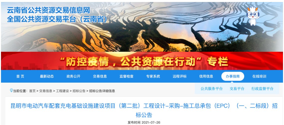 7月26日,昆明發(fā)展新能源產(chǎn)業(yè)投資運營有限公司發(fā)布昆明市電動汽車配套充電基礎(chǔ)設(shè)施建設(shè)項目(第二批)工程設(shè)計-采購-施工總承包(EPC)(一、二標(biāo)段)招標(biāo)公告。