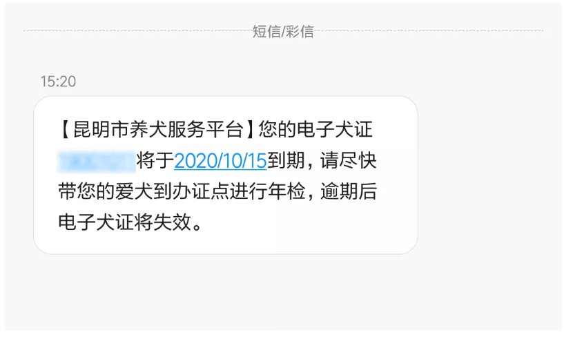 已辦理電子犬證(自登記日期起,有效期為12個(gè)月),當(dāng)電子犬證有效期不足1個(gè)月時(shí),平臺(tái)會(huì)發(fā)送短信提示犬主。