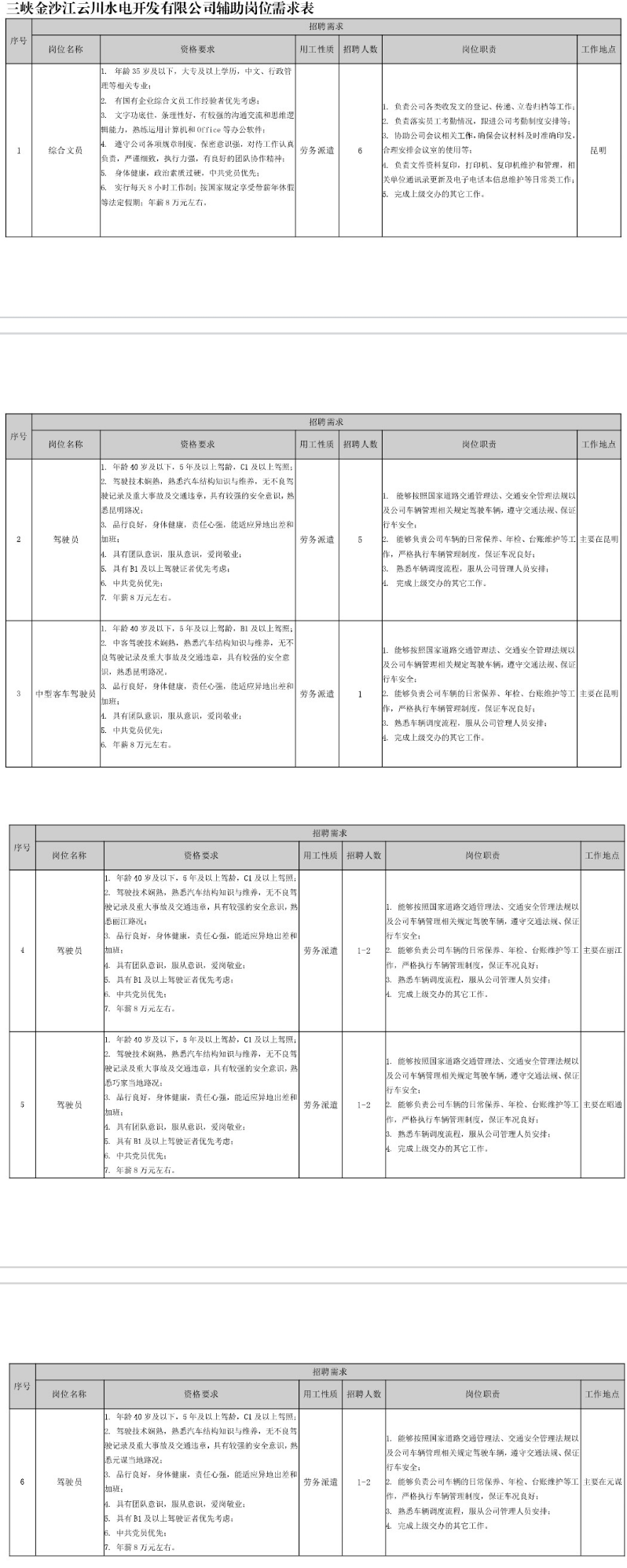 一、招聘崗位及要求(詳見三峽金沙江云川水電開發(fā)有限公司輔助崗位需求表)