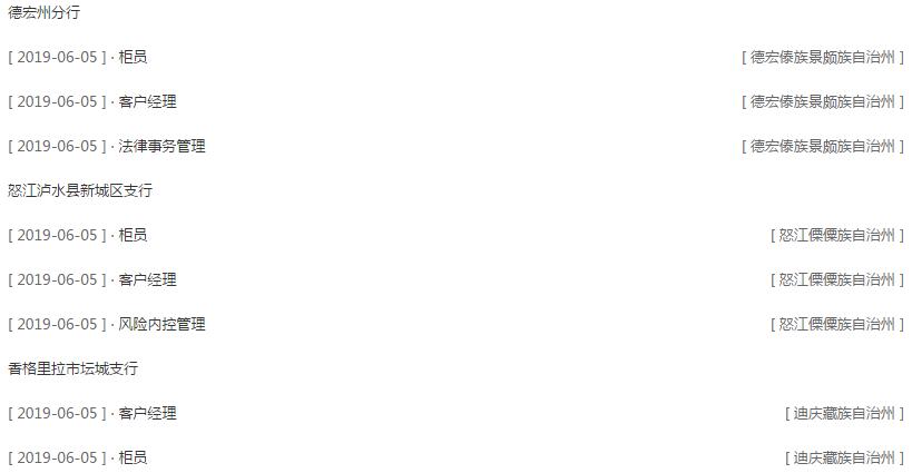 其中,怒江瀘水縣新城區(qū)支行、迪慶香格里拉縣壇城支行招聘學(xué)歷條件為具有國(guó)家統(tǒng)招的普通高等院校大學(xué)專科(含)以上學(xué)歷。