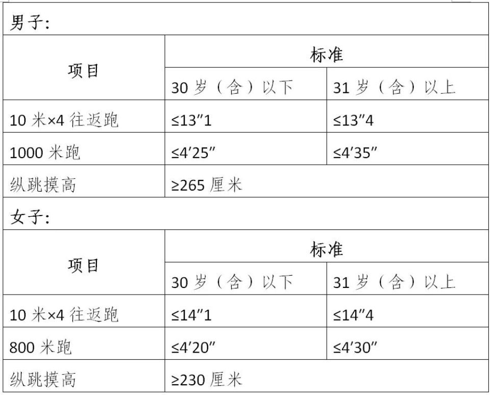 其標(biāo)準(zhǔn)按照招錄人民警察標(biāo)準(zhǔn)(人社部發(fā)〔2011〕48號(hào))執(zhí)行,達(dá)不到以下標(biāo)準(zhǔn)的視為體能測(cè)評(píng)不合格。體能測(cè)評(píng)標(biāo)準(zhǔn)為: