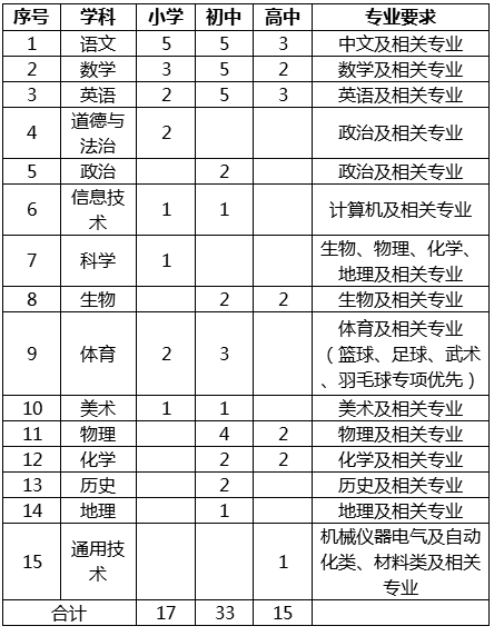 全日制大學(xué)本科及以上學(xué)歷,中級及以上職稱或教學(xué)經(jīng)驗(yàn)豐富的教師可適當(dāng)放寬學(xué)歷要求;持有應(yīng)聘崗位相應(yīng)學(xué)科相應(yīng)等級的教師資格證;普通話水平須二級乙等及以上,語文學(xué)科崗位須二級甲等及以上;雙一流大學(xué)畢業(yè)生以及獲得市級骨干教師、學(xué)科帶頭人、教壇新秀等稱號的教師同等條件下優(yōu)先考慮。