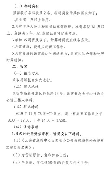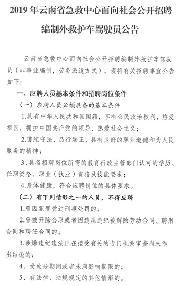 2019年云南省急救中心面向社會公開招聘編制外救護車駕駛員公告