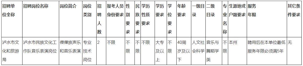 為傳承和弘揚(yáng)瀘水主體民族民間音樂歌舞藝術(shù),培養(yǎng)瀘水少數(shù)民族音樂和歌舞表演藝術(shù)人才,經(jīng)怒江州人民政府同意,現(xiàn)面向全州特招特聘瀘水市民族文化工作隊(duì)音樂表演演員2名。現(xiàn)將有關(guān)事項(xiàng)公告如下: